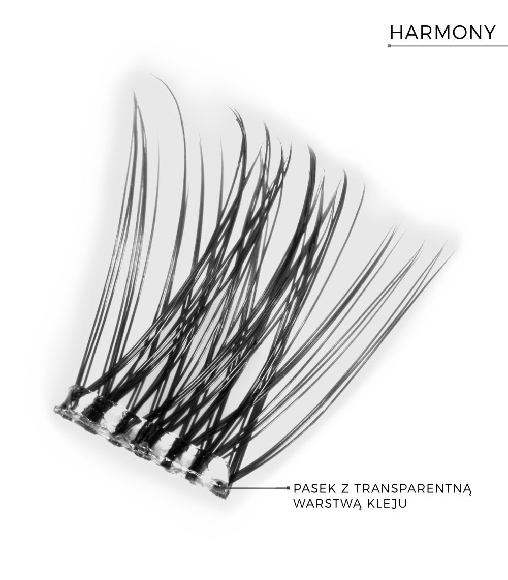 Model rzęs Harmony w wersji Pre-Glued to wybór dla osób, które cenią wygodę, oraz efektowne spojrzenie. Splot rzęs wykonany jest w taki sposób, aby zapewnić naturalny, ale wyrazisty efekt. Rzęsy są gęste, ale wyglądają lekko, co sprawia, że spojrzenie staje się głębsze. Każdy pasek, na którym osadzona jest kępka rzęs został pokryty warstwą kleju, dzięki czemu aplikacja staje się szybka i bezproblemowa, a stylizacja zapewnia komfort noszenia przez cały dzień.